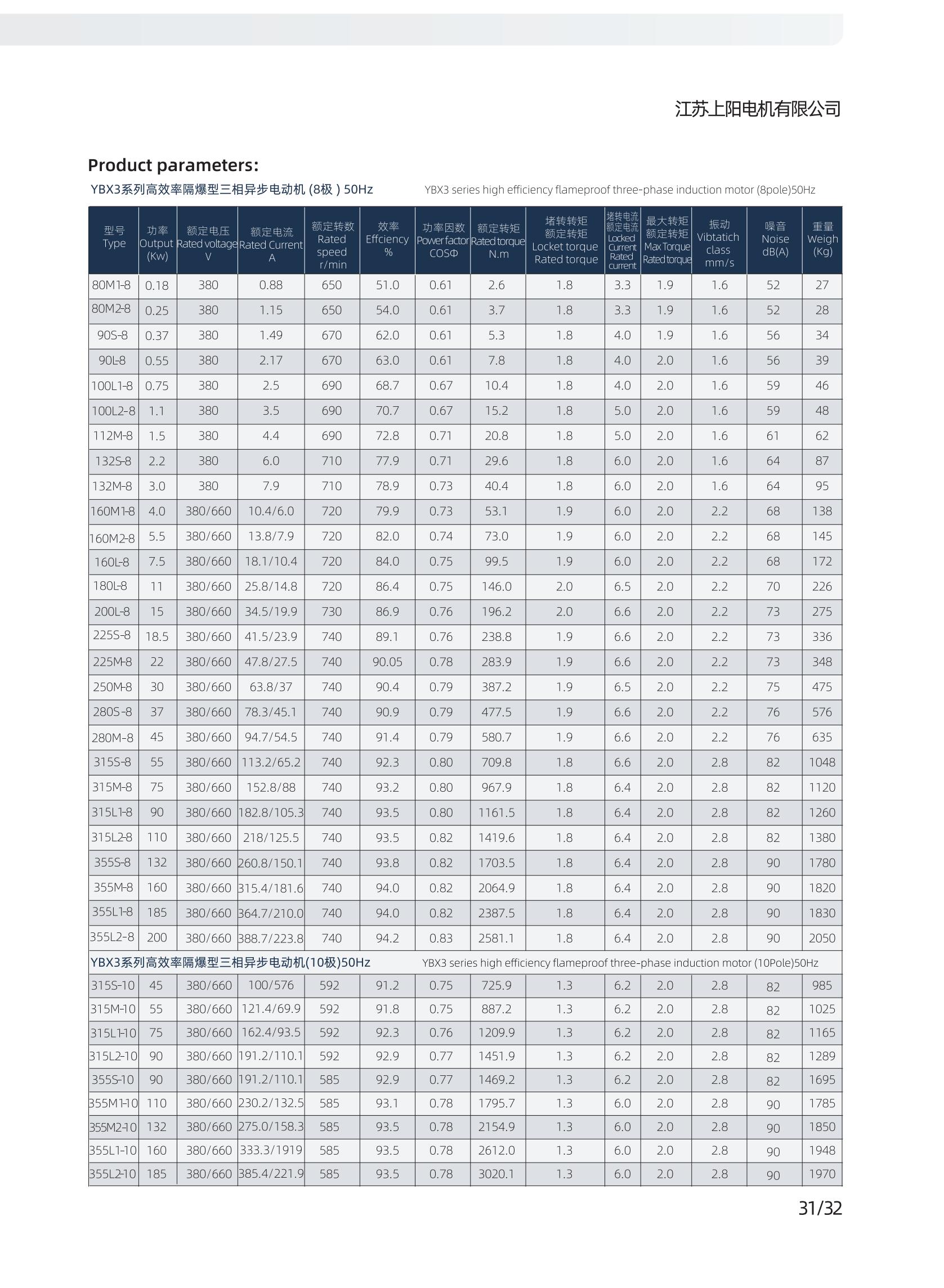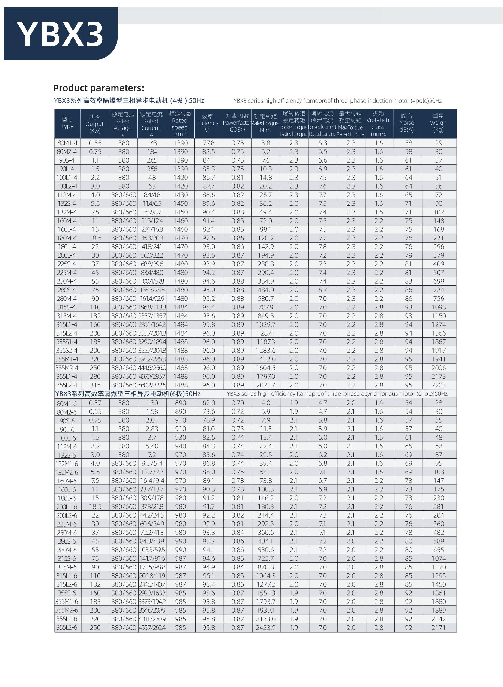 YBX3系列高效率隔爆型三相異步電動機(jī)是YB3系列的更新?lián)Q代產(chǎn)品。本系列電動機(jī)具有高效節(jié)能、溫升裕度大、體積小、重量輕、外形美觀、運(yùn)行可靠、性能好、噪聲低、振動小、使用維護(hù)方便的優(yōu)點(diǎn)。本系列電動機(jī)的效率指標(biāo)符合GB18613-2012《中小型三相異步電動機(jī)能效限定值及能效等級》電動機(jī)能效2級,其功率等級、安裝尺寸符合IEC的標(biāo)準(zhǔn)并與YB3系列電機(jī)相同。 本系列電動機(jī)的防爆性能符合GB3836.1-2010《爆炸性環(huán)境 第1部分:通用要求》和 GB3836.2-2010《爆炸性環(huán)境 第2部分:由隔爆外殼“d”保護(hù)的設(shè)備 》標(biāo)準(zhǔn)的規(guī)定,分別制成隔爆型Exd I Mb、ExdⅡBT4 Gb、ExdⅡBT4 Gb、ExdICT4 Gb,適用于煤礦井下(非采掘工作面)及工廠ⅡA、ⅡB、ⅡC級,溫度組分別為T1~T4的爆炸性氣體環(huán)境的危險(xiǎn)場所。 在YB3電動機(jī)的基礎(chǔ)上,也可以制成YB3-W戶外型、YB3-TH戶內(nèi)濕熱型、YB3-WTH戶外濕熱型、YB3-WT戶外熱帶型及YB3-WF1戶外中等防腐蝕氣候環(huán)境。