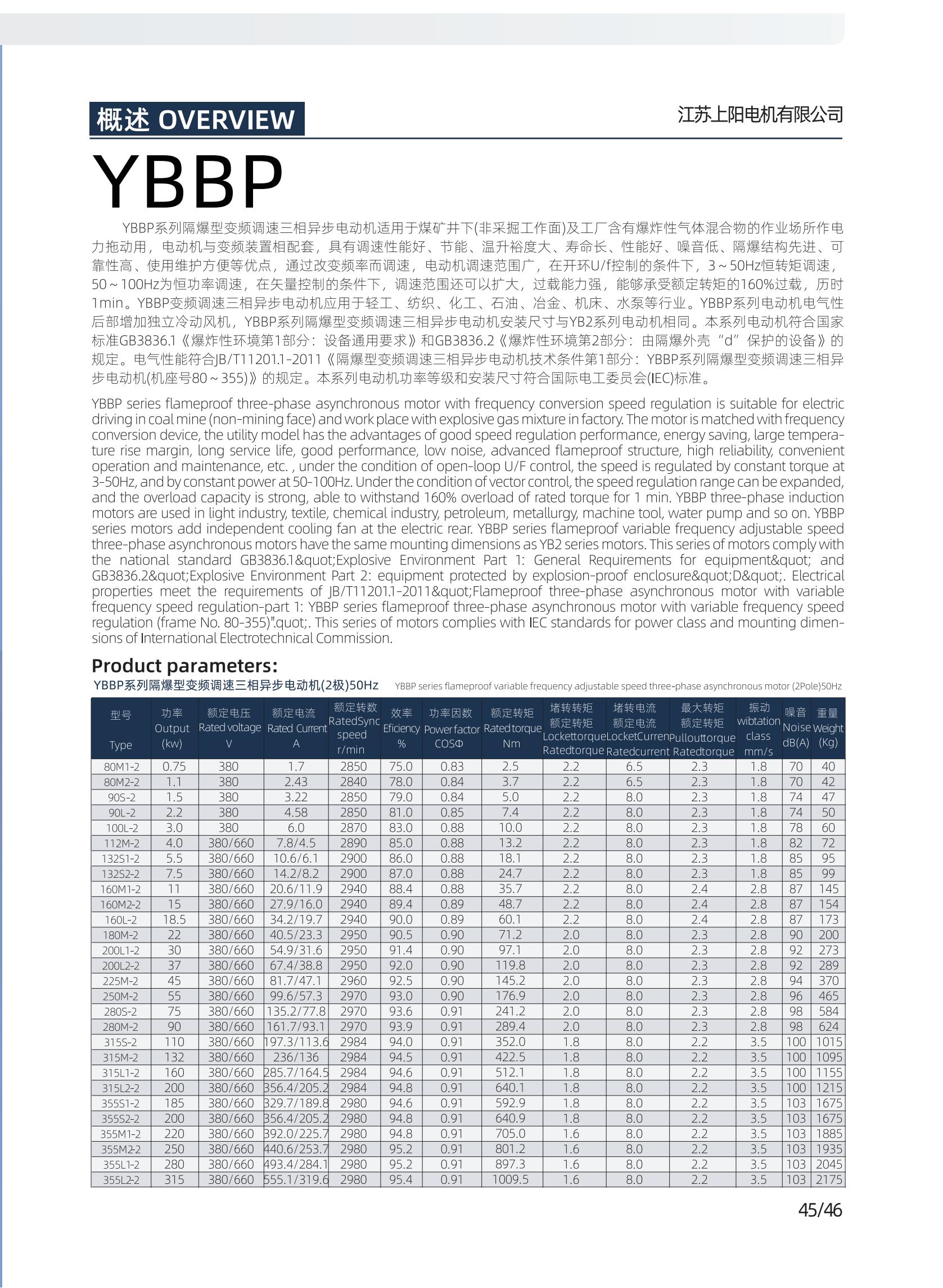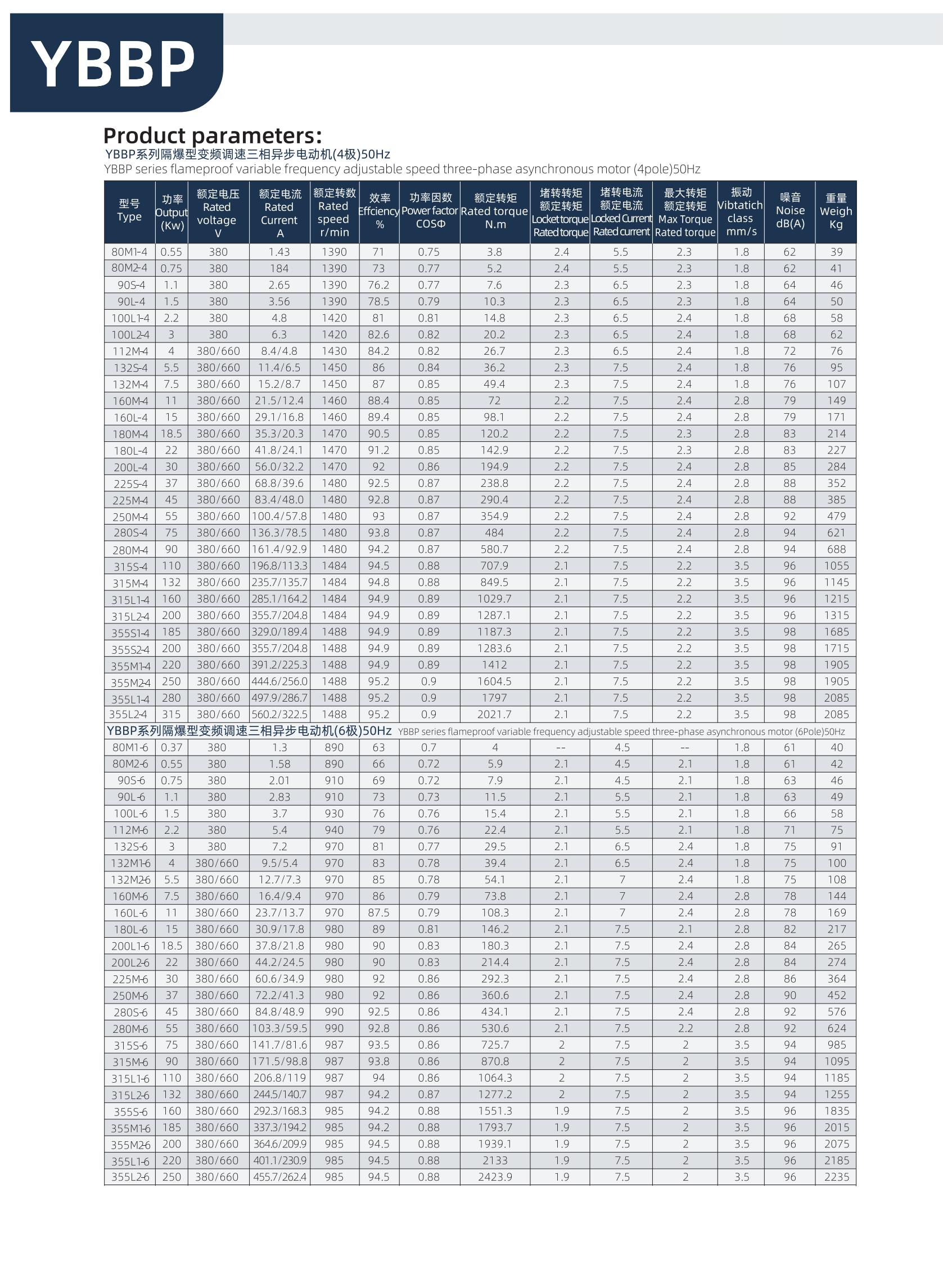 系列隔爆型變頻調速三相異步電動機適用于煤礦井下(非采掘工作面)及工廠含有爆炸性氣體混合物的作業(yè)場所作電力拖動用,電動機與變頻裝置相配套,具有調速性能好、節(jié)能、溫升裕度大、壽命長、性能好、噪音低、隔爆結構先進、可靠性高、使用維護方便等優(yōu)點,通過改變頻率而調速,電動機調速范圍廣,在開環(huán)U/f控制的條件下,3~50Hz恒轉矩調速,50~100Hz為恒功率調速,在矢量控制的條件下,調速范圍還可以擴大,過載能力強,能夠承受額定轉矩的160%過載,歷時1min。 YBBP 變頻調速三相異步電動機應用于輕工、紡織、化工、石油、冶金、機床、水泵等行業(yè)。YBBP系列電動機電氣性后部增加獨立冷動風機,YBBP系列隔爆型變頻調速三相異步電動機安裝尺寸與YB2系列電動機相同。 本系列電動機符合國家標準GB3836.1《爆炸性環(huán)境 第1部分:設備 通用要求》和GB3836.2《爆炸性環(huán)境 第2部分:由隔爆外殼“d”保護的設備 》的規(guī)定電氣性能符合JB/T 11201.1-2011《隔爆型變頻調速三相異步電動機技術條件 第1部分:YBBP系列隔爆型變頻調速三相異步電動機(機座號80~355)》的規(guī)定。本系列電動機功率等級和安裝尺寸符合國際電工委員會(IEC)標準